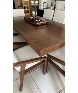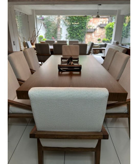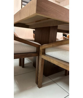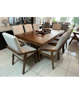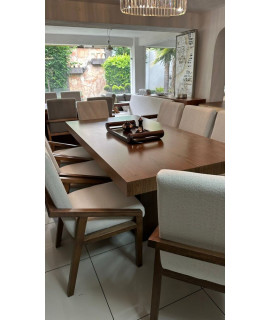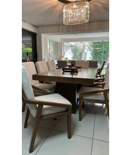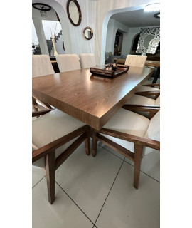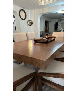 El comedor Dharani destaca por su elegancia y durabilidad. Con su cubierta de chapa de nogal, base de madera de pino y una amplia variedad de opciones de tapizado, este comedor se adapta a diferentes tamaños de grupo y estilos de decoración, disfruta de comidas y reuniones memorables en el comedor Dharani, nuestro producto estrella.