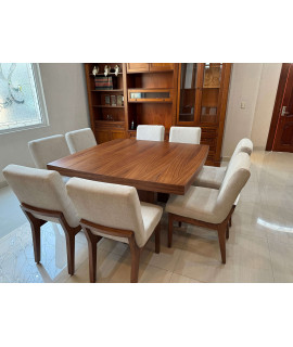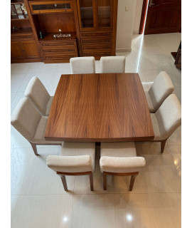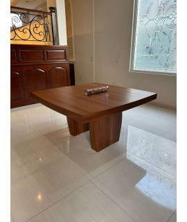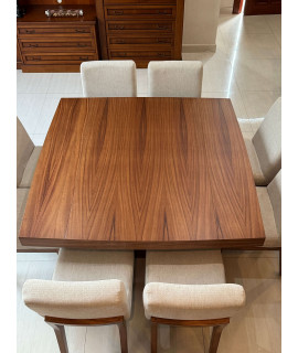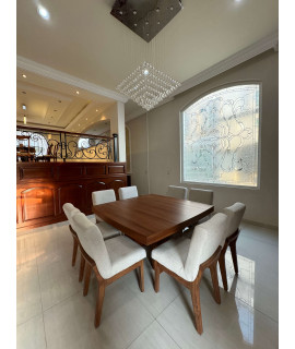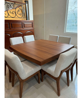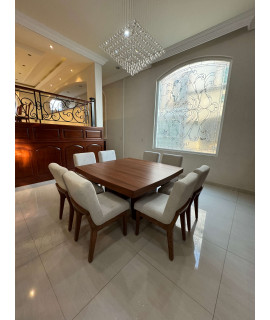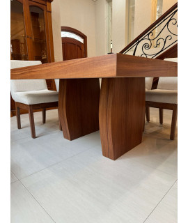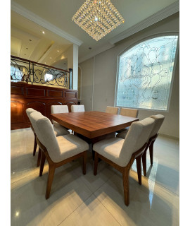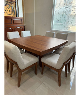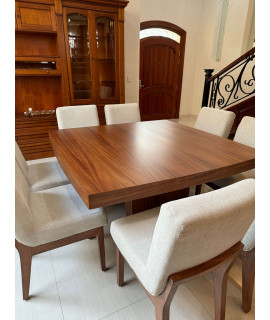 Este elegante comedor, diseñado para acomodar a ocho o seis personas, combina funcionalidad y estilo en una pieza que destaca por su diseño innovador. La mesa, disponible en forma cuadrada, está elaborada en chapa de parota, una madera de tonos cálidos y vetas únicas que aportan un toque sofisticado y natural al espacio.